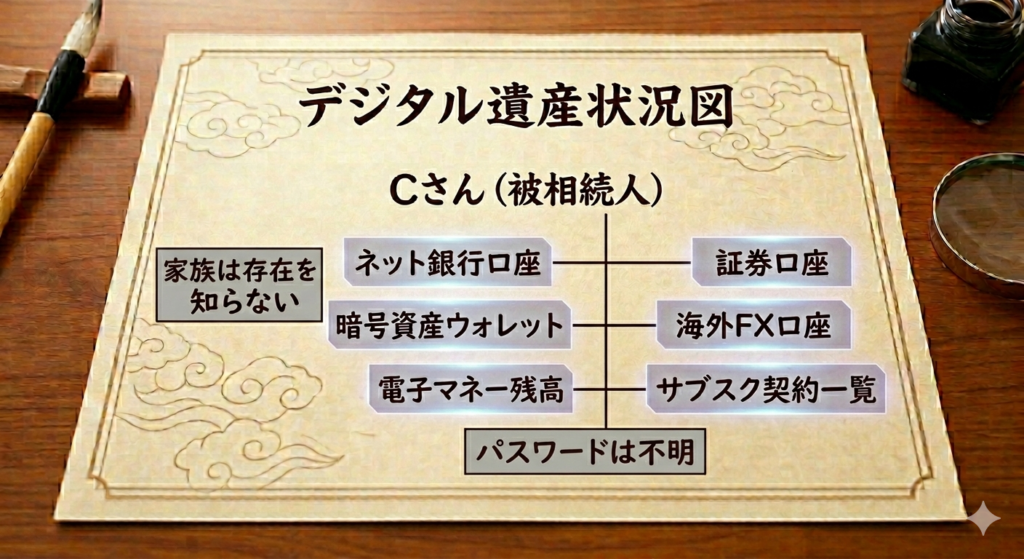 30代女性のCさんは、資産運用に積極的で、ネット銀行、証券口座、暗号資産(仮想通貨)などを複数保有していました。 若い世代特有の問題は、財産が「目に見えない」デジタルデータであることです。Cさんは万が一の備えをしていなかったため、家族がその全貌を把握することは不可能に近い状態でした。