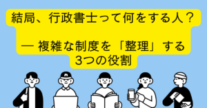 1.行政書士は、複雑な制度と現状を繋ぐ「状況整理」の専門家 行政書士試験に合格したと伝えると、ほとんど必ず聞かれるのが、次の質問です。 「行政書士って、結局何をする人なんですか?」 この記事では、私が実務で大切だと考える […]